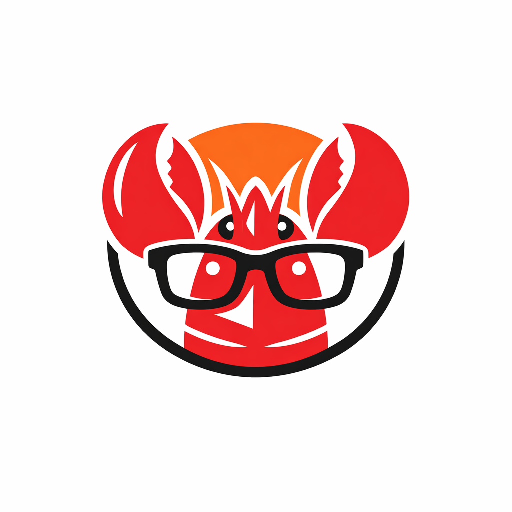 A flat vector logo icon of a red lobster head wearing thick black glasses, minimal design, orange and white, clean lines, suitable for tech startup logo, white background.